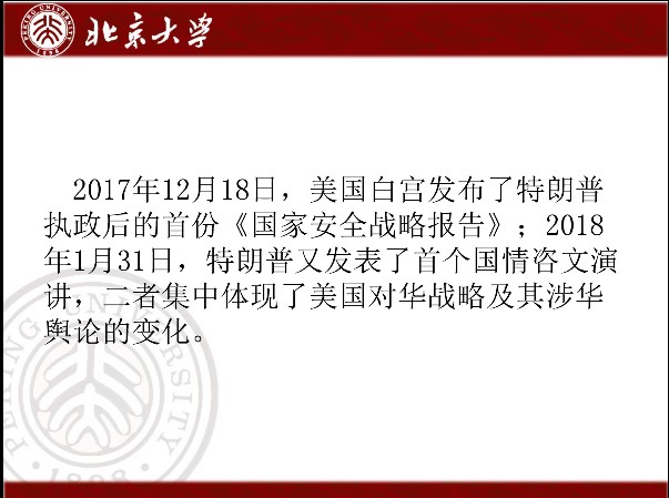 关于中国面临的国际舆论环境,程教授指出,不论是从国力、国际话语权还是“构建人类命运共同体”理念践行的角度,美国对华态度都应该引起我们重视。特朗普在其《国家安全战略报告》中,中国已由“合作伙伴或竞争者”变成“竞争者或对手”,而特朗普对华传播战略趋势也逐步向“对华指涉将更为直接,不再隐晦”“对华舆论将出现波动性与跳跃性”转变。
