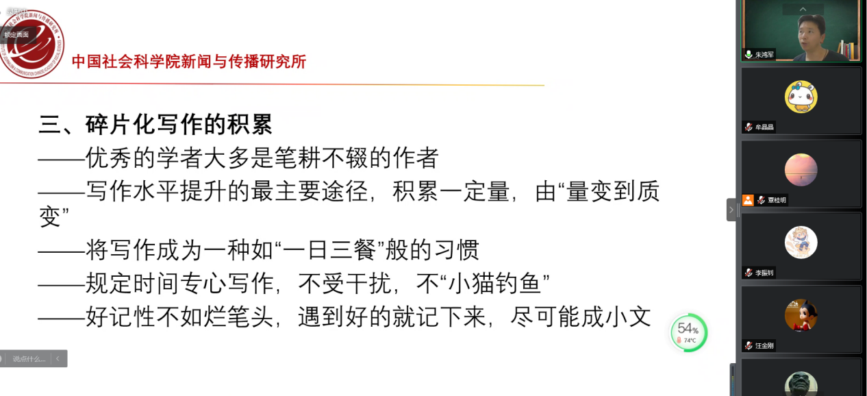 朱鸿军老师以自己逐渐培养跑步的习惯作类比,鼓励青年学者多动笔,并提出规划好时间、不“小猫钓鱼”等灵活练笔的小技巧,同时提醒大家在日常写作中就要遵守研究规范,投稿时严格遵照各个学刊的注释体系,由此才能提高投稿成功率。“任何一个编辑都不会拒绝好的稿件”是朱鸿军老师对青年学者的温情鼓舞!