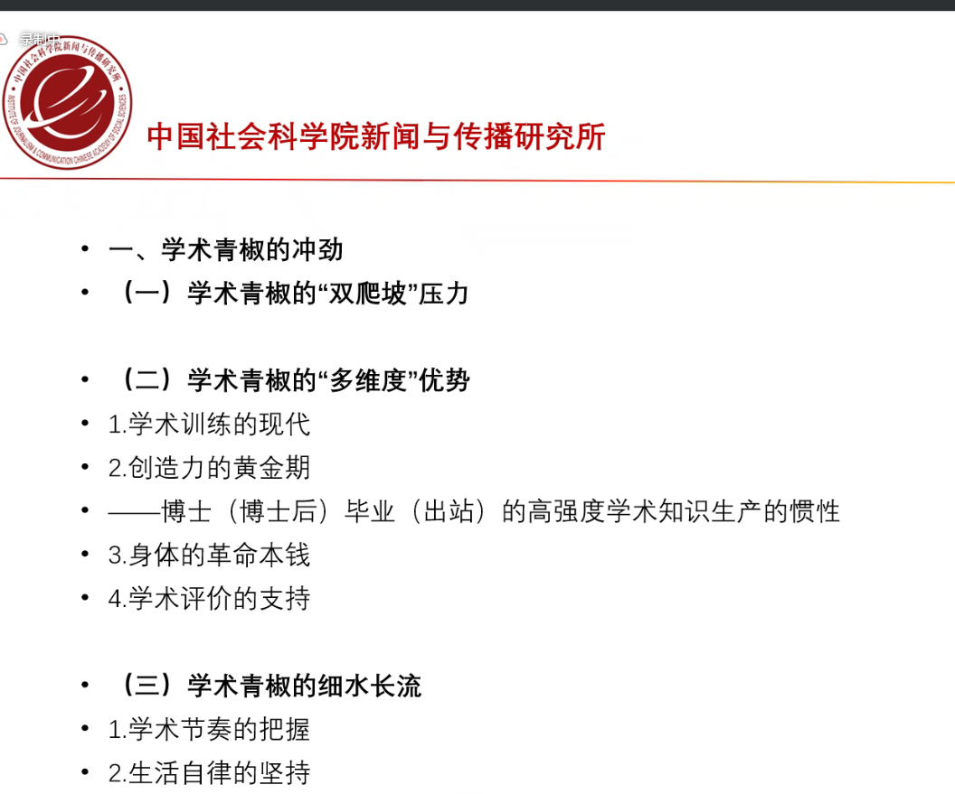 “学术青椒”是朱鸿军老师认为学术之路上最宝贵的阶段,他认为硕博毕业后的2-5年是学术研究的黄金时期,要抓住学术生涯中不多见的这一段时光才能跟上研究的步伐,尽管面临着现实生活与学术爬坡的双重压力,但只要注重发挥这一阶段体力与脑力等多维度优势,明确新闻与传播学科的知识谱系设计,细水长流,定能有理想的产出。