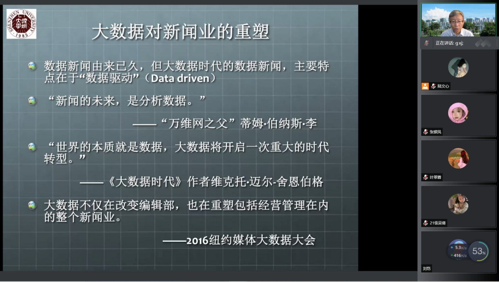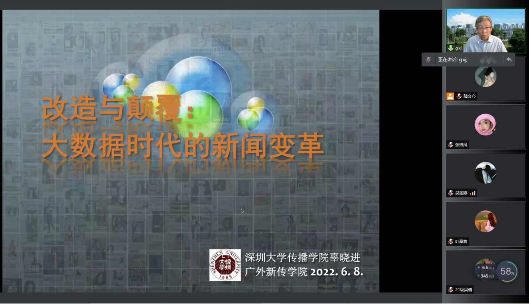 6月8日,深圳大学传播学院特聘教授、博士生导师辜晓进教授为广外新闻与传播学院的研究生同学带来一场主题为《改造与颠覆:大数据时代的新闻变革》的线上讲座。