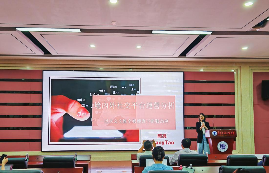 为进一步提升学生的专业素养,拓展国际化视野,4月25日下午,新闻与传播学院学术与行业前沿系列讲座在大学城校区教学楼C201报告厅举行。学院邀请了香港大公文汇传媒集团全媒体新闻中心融媒工作部总监陶亮作题为《境内外社交平台运营分析——以大公文汇全媒体旗下账号为例》的专题讲座。学院院长侯迎忠主持讲座,学院2023级全体研究生及本科生代表参与本次讲座。