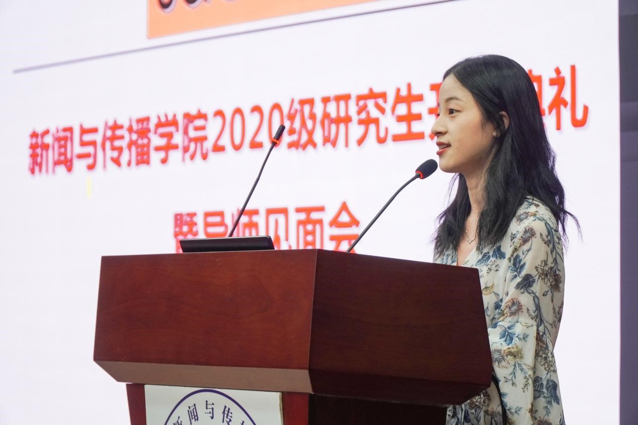 除了教授和老师们的敦敦教诲,新闻学院19级优秀研究生、学硕学业奖学金一等奖获得者汪洋同学也现身说法,她从过来人的经历,分享了研究生阶段的学习方法,并鼓励新生要从问题出发,多读书、多思考。新生代表王则空同学则以幽默的话语和轻松的表达方式阐释了自身对新闻的理解,他认为新闻工作者应该在面对固有事物的时候保留自我的观点和思考,并结合自身经历进行补充,赢得台下阵阵掌声。